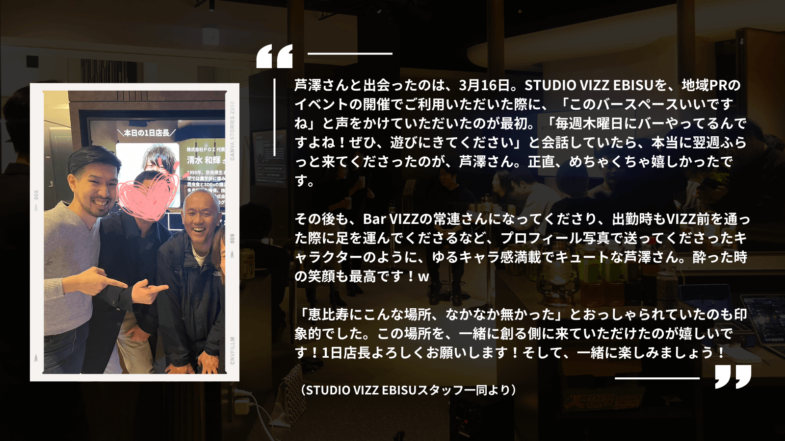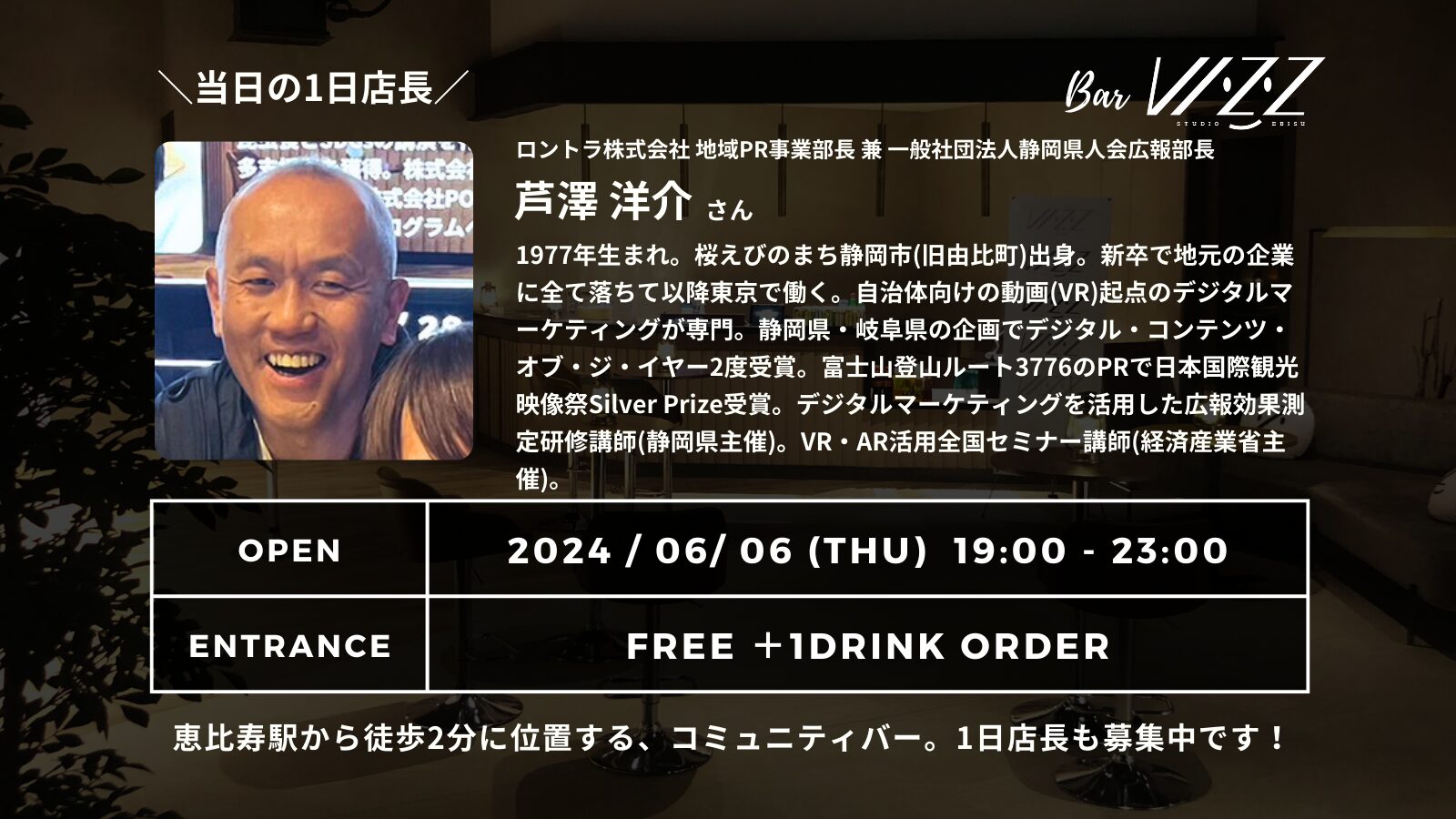 【6月6日(木)】Bar VIZZ 〜ロントラ株式会社 地域PR事業部長 芦澤 洋介さんが1日店長を務めます〜