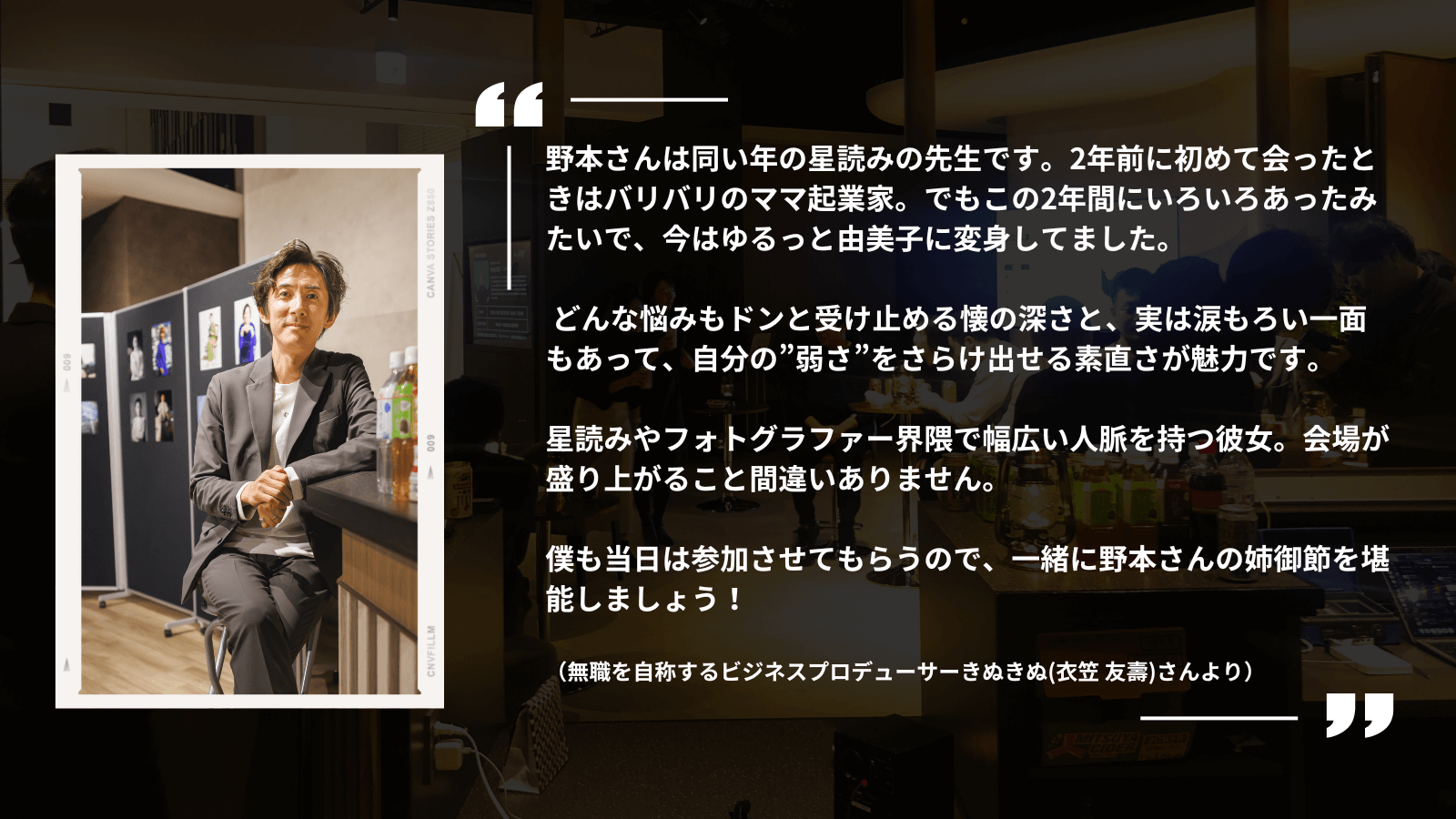 当日、BarVIZZにお越しいただいた方を対象に、野本さんによる3分鑑定をプレゼント!