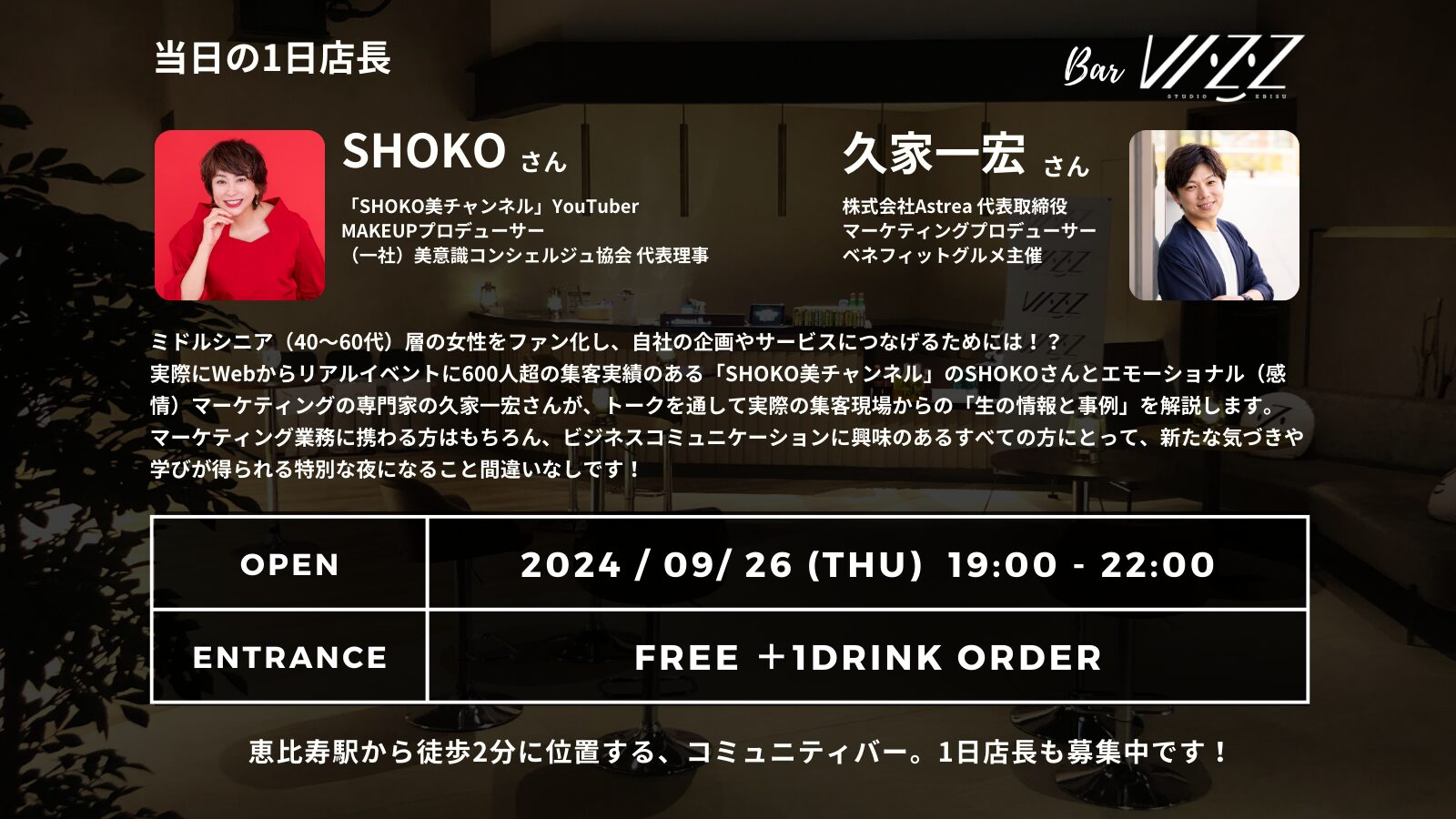 【9月26日(木)】Bar VIZZ 40代〜60代ミドルシニア世代の集客に強い!「SHOKO美チャンネル」のSHOKOさんと、株式会社Astrea 代表取締役 久家一宏さんが一日店長を務めます!