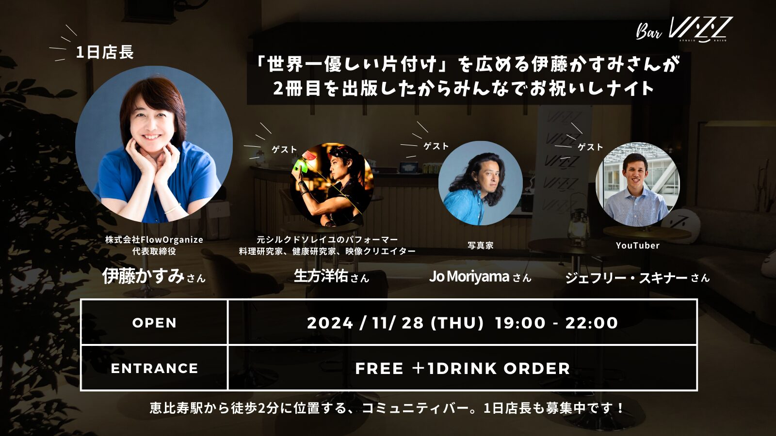 【11月28日(木)】Bar VIZZ 「世界一優しい片付け」を広める伊藤かすみさんが2冊目を出版したからみんなでお祝いしナイト