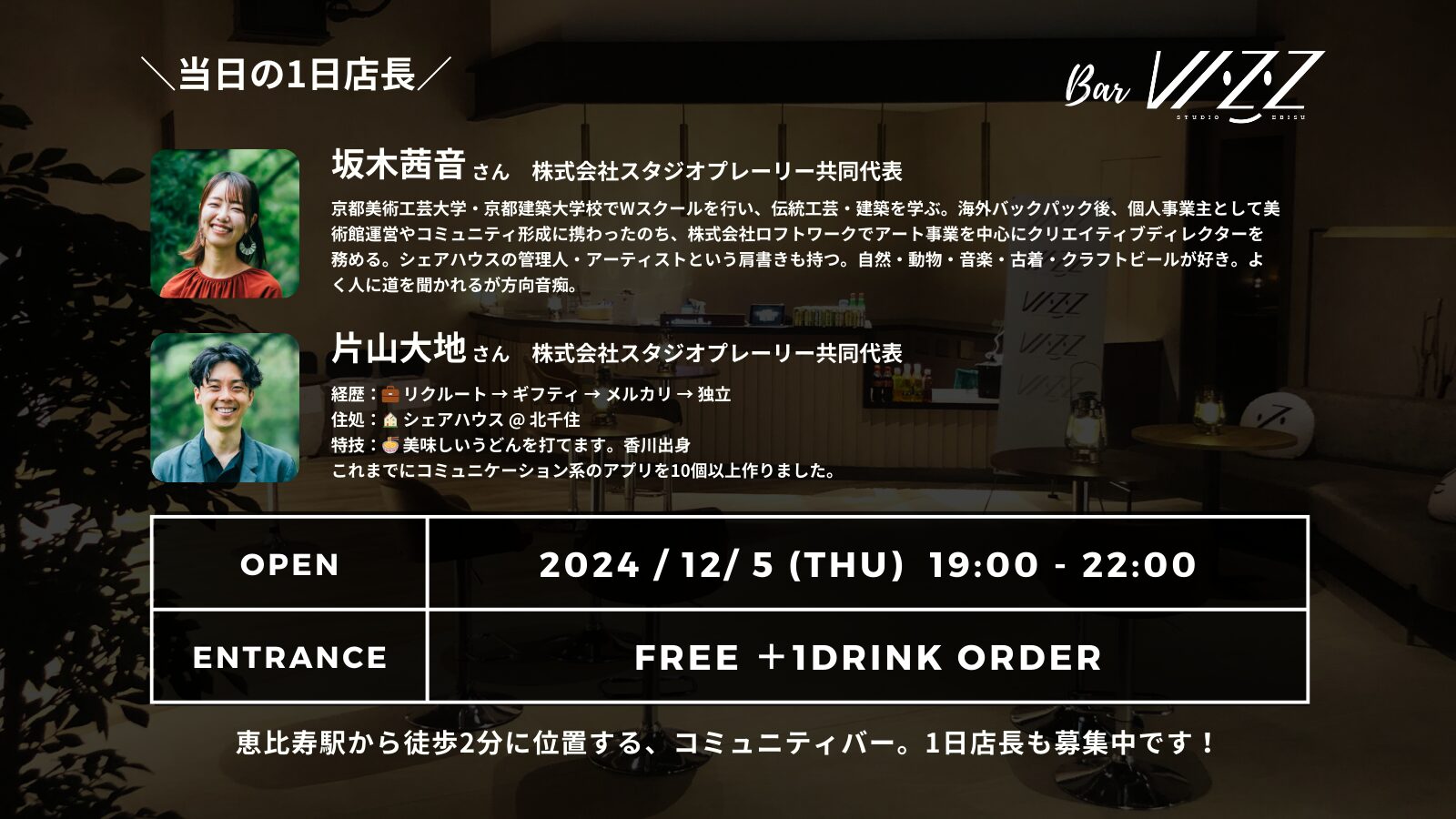 【12月5日(木)】Bar VIZZ プレーリーカード共同代表のお二人が一日店長を務めます!
