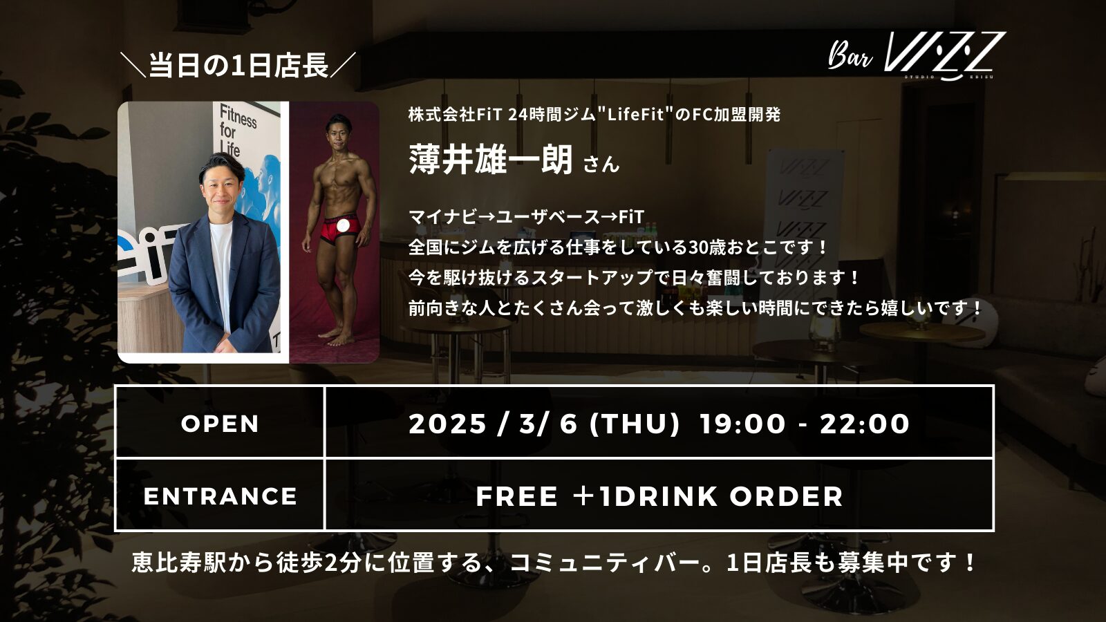 3月6日(木)は、株式会社FiT 24時間ジム”LifeFit”のFC加盟開発の薄井雄一朗さんが一日店長を務めます!