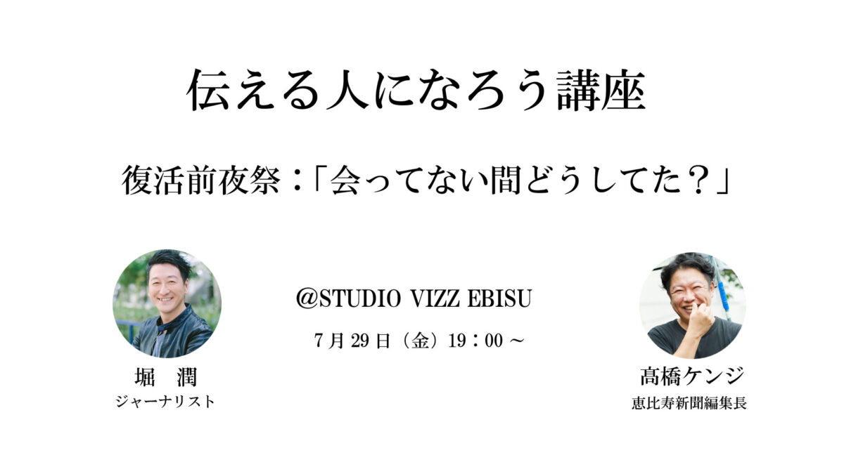 ジャーナリスト堀潤と恵比寿新聞高橋ケンジがお送りする「伝える人になろう講座」4年ぶりに復活。