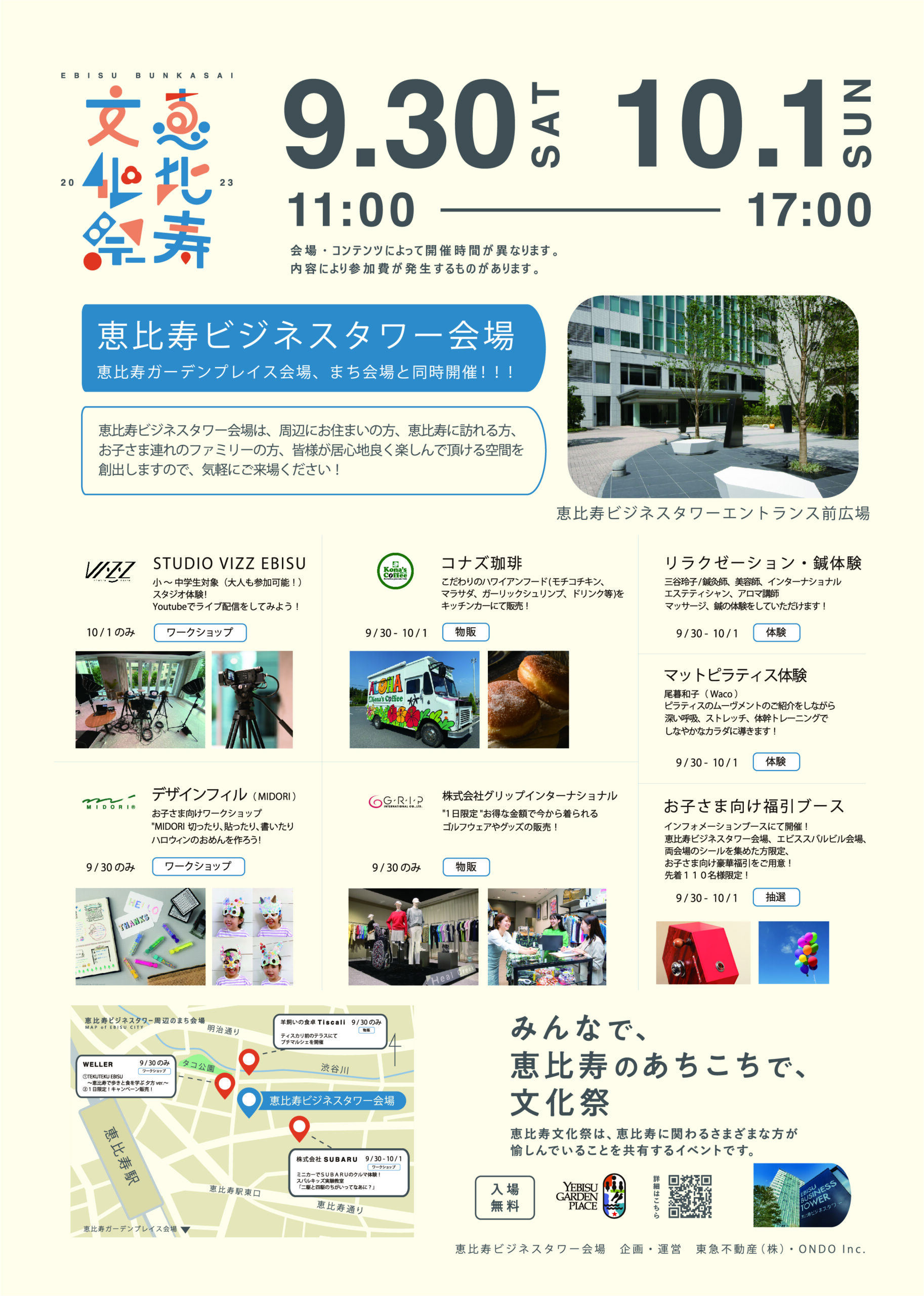 そして今年は、STUDIO VIZZ EBISUがある「恵比寿ビジネスタワー」も一つの会場として参加し、トリドールさんのコナズ珈琲、ピラティス体験、スタジオでのワークショップ(YouTube配信体験)などのイベントを実施。ぜひお気軽にお越しください。